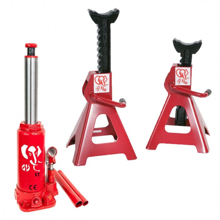 Bottle jack 6 ton 332 mm dish height and Jack stand JJ 6 ton 2 pieces 400-630 mm Plug & Play