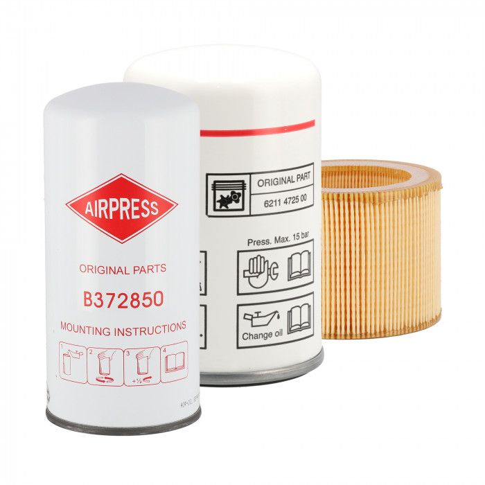 | Characteristics | Maintenance on a screw compressor should be performed annually or every 2000 hours. Service kit (B) consisting of: - Air filter - Oil filter - Separator filter |